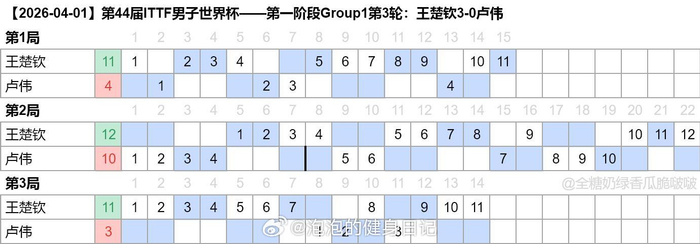 #王楚钦3比0卢伟#2026澳门世界杯,王楚钦状态火热。4月1日小组赛末轮,他以3-0(11-4、12-10、11-3)横扫澳大利亚选手卢伟,小组赛两连胜,以小组第一强势晋级16强。首战约内斯库,他第三局轰出11-1,展现统治力。此战对阵卢伟,虽第二局12-10险胜,遭遇顽强抵抗,但王楚钦关键分处理冷静,全程仅用时22分钟便锁定胜局。作为世界第一,王楚...